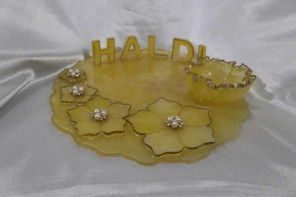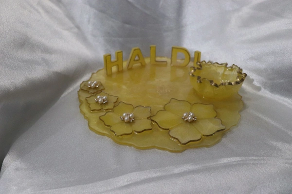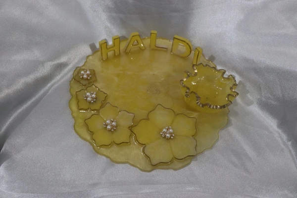 - Haldi Letters: Intricately crafted "Haldi" letters give the thali a personalized and festive touch.